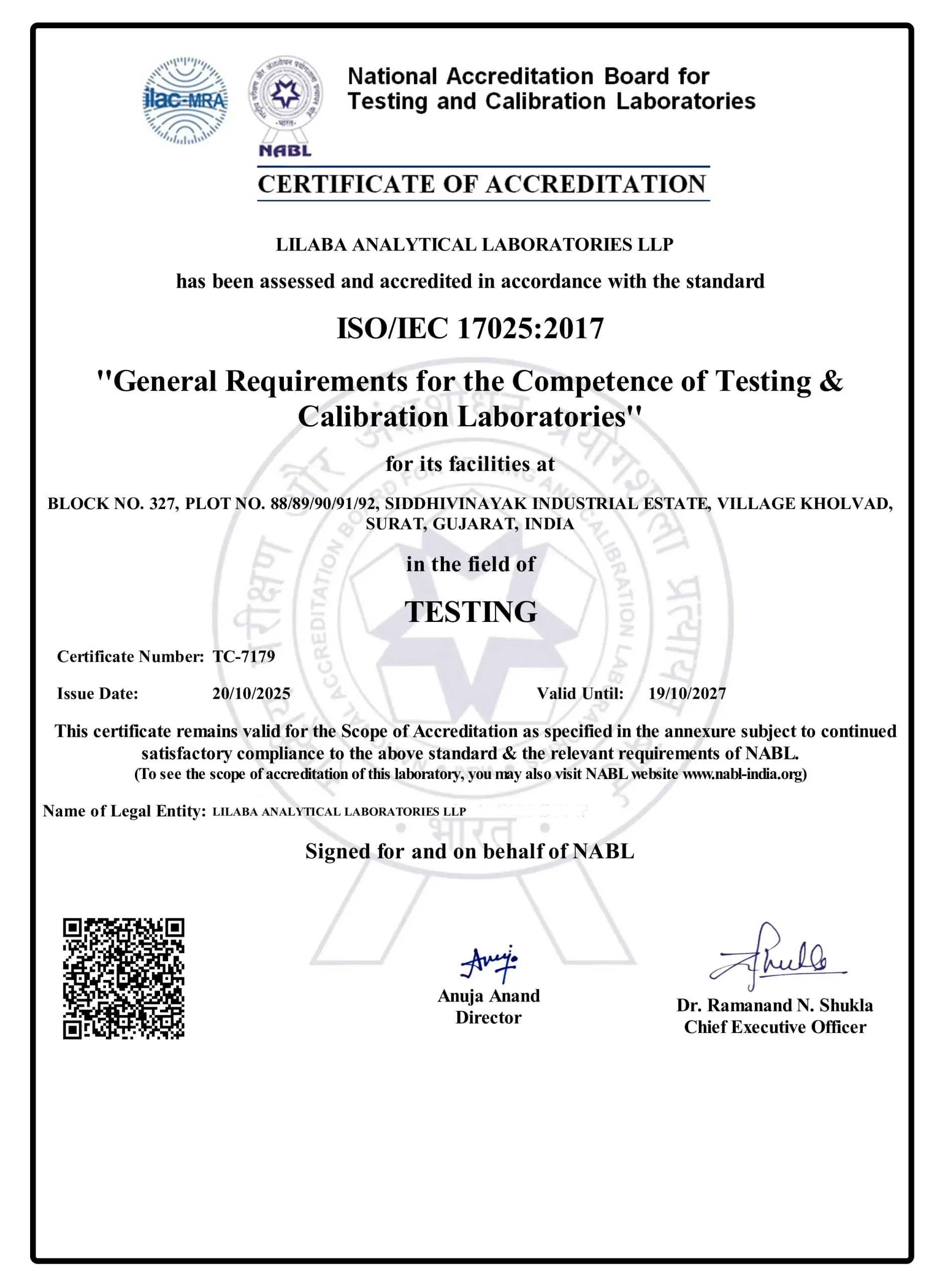 NABL accreditation under ISO/IEC 17025 confirms the lab’s competence—validated methods, calibrated instruments, trained analysts, and proper QA systems. In short, results from this lab are technically reliable and auditable.
